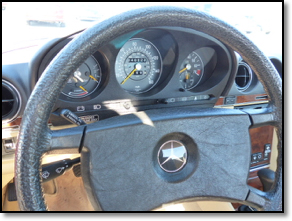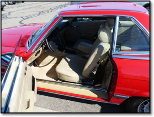 Greg says that both Mom and Dad loved traveling in the SL, and they took it to San Diego, Las Vegas, and the Grand Canyon. Maintenance was performed in the early years by the Mercedes dealer in Scottsdale, later an independent mechanic in Tempe serviced it. The car has never been driven in snow and consequently the body and undercarriage are rust free. Greg mentions that the hardtop was removed only once in all the years that his parents owned the car; the soft top is in near-perfect condition with no tears, sagging, and heavy creases. Some cloudiness in the plastic windows is now removed each spring.